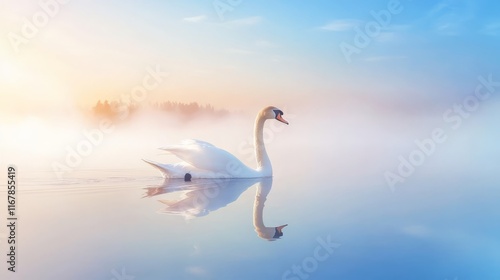 Misty Morning Serenity: Tranquil Lake with Graceful Swan Gliding on Water Surface