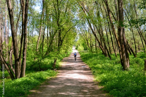 Mlocinski Park or Forest. One, single cyclist on the path in the forest park located in Bielany district in Warsaw, Poland