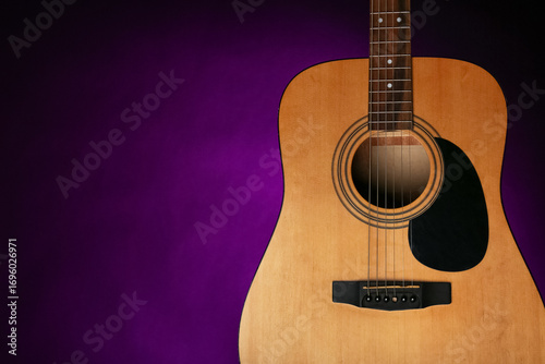 Modern acoustic guitar on purple background, closeup