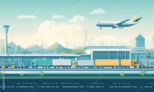 Modern airport scene with planes, trains, and a city skyline in a vibrant, illustrated style.
