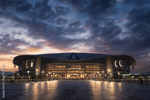 Modern empty outdoor stage building with dramatic sky background during twilight.