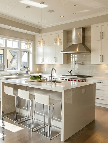 Modern kitchen with sleek design, featuring an island, stools, and stainless steel appliances.