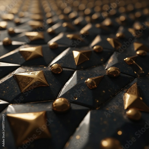 Modern Luxury Abstract Pattern of 3D Geometric Black Facets and Gold Spheres