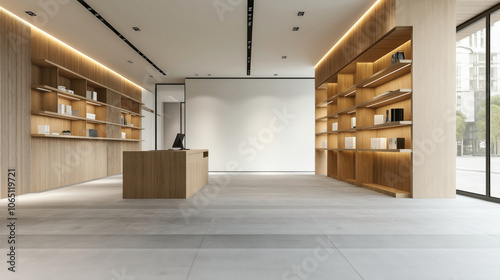 Modern minimalist retail store interior with wooden shelves, a reception counter, and soft lighting. The space is open with large windows and neutral colors.