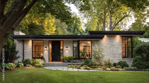 Modern Ranch House Design: Stone Exterior, Landscaping, Evening Light
