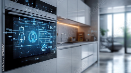 Modern smart kitchen with a futuristic interface displayed on the oven, sleek white cabinets, and a cozy dining area in the background.