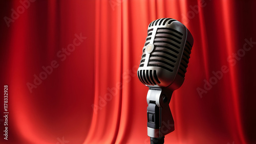 Modern studio microphone on stage displayed on a vibrant red studio background.