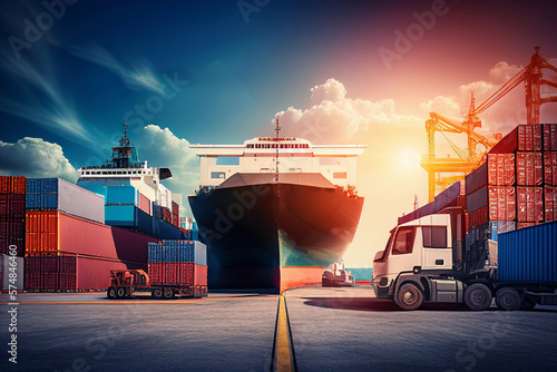 Modern System transportation and logistic import export and transport industry of truck container cargo ship and cargo plane with working crane bridge in shipyard at sunset sky. Generative AI