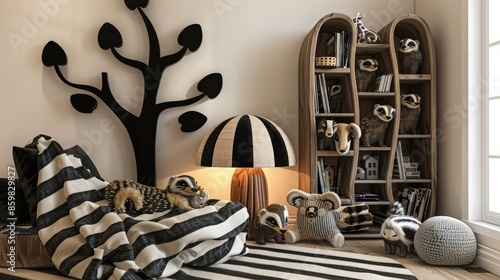 Monochromatic nursery decor featuring a black and white striped textile and dark tree silhouette isolated on a light wall.