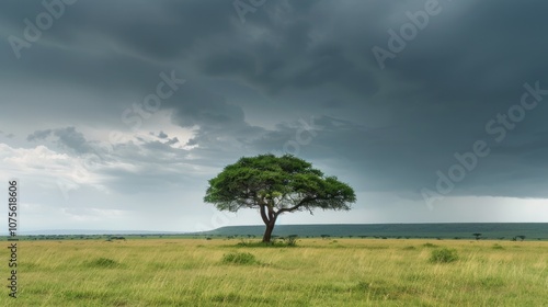 Moody Skies: A Lone Acacia Tree Standing Firm Amidst Stormy African Sky in Masai Mara National Reserve