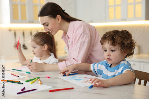 Mother and her little children drawing with colorful markers at table in kitchen