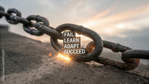 Motivational Chain Link with Inspirational Words Fail, Learn, Adapt, Succeed Against Dramatic Sunrise Background on a Gritty Surface