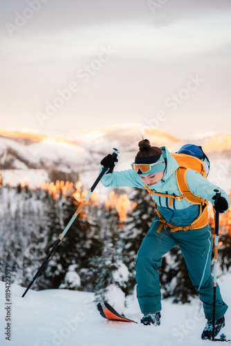 Mountaineer backcountry ski walking ski alpinist in the mountains. Ski touring in alpine landscape with snowy trees. Adventure winter sport. Low Tatras, slovakia