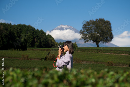Mt.Fuji and Tea farm in spring at Shizuoka prefecture with cloudy sky