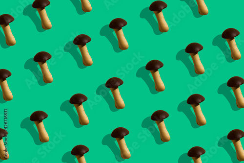Multicolor geometric background with mushroom cookies. Colored paper texture. Minimalism background