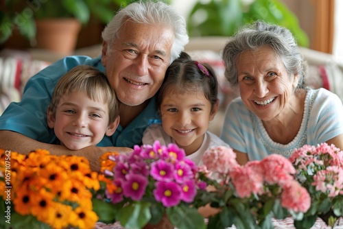 Multi-generational family of three enjoying a bright moment while planting flowers