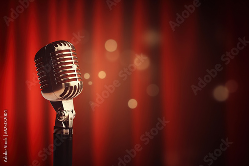 Music, vocals, karaoke, performance concept. Concert silver vocal microphone in vintage design on a red backstage background, copy space