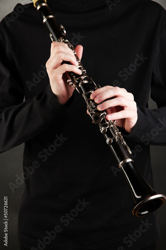 Musician playing on clarinet on black background