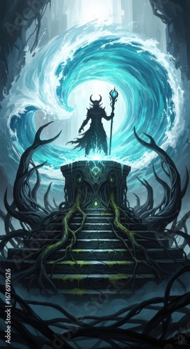 Mystical realm with sorcerer on an altar amidst a vibrant portal