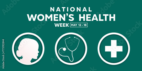 National Womens Health Week. Women, stethoscope and plus icon. Great for cards, banners, posters, social media and more. Green background.