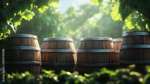 Neatly arranged wooden barrels in a vineyard setting, with a backdrop of lush greenery and soft sunlight filtering through the trees.