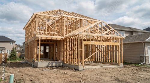 New house construction framing with visible wooden beams and structure under a cloudy sky