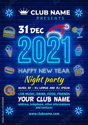 New Year 2021 celebrations night party poster template with Neon lettering and holiday subjects such as drinks, fast food, desserts. Blue brick wall on background. Vector illustration.
