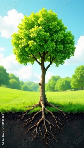 Newborn trees growing tall in sunny meadow with roots visible above ground , tree, foliage