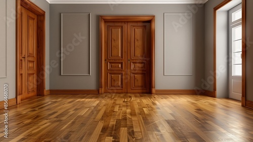 Newly painted and empty room with oak wood carpentry doors and wooden floors : Generative AI