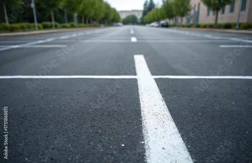 Newly paved asphalt street, empty parking lot. Fresh white painted lines clearly mark distinct spaces. Tall green trees, blurred modern buildings line city road. Clean urban area shows recent