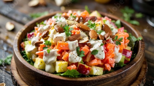 Nutritious carrot and apple salad with almonds. This dish is a classic of healthy eating, popular in European and American cuisines as a light vitamin snack.
