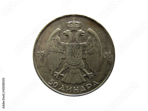 Obverse of Yugoslavia coin 50 dinara 1938 with inscription meaning 50 DINARS.