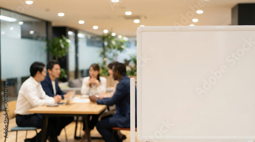 Office meeting business team whiteboard presentation planning conference, colleagues around table in modern workspace, blank board for copy, collaboration and strategy discussion with soft focus