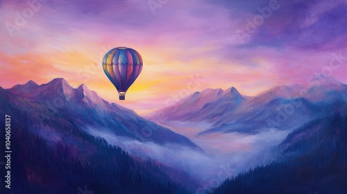 Oil painting depicting a vibrant purple sunset sky with a colorful hot air balloon soaring over scenic romantic mountains and fog capturing a couple s dreamy getaway experience