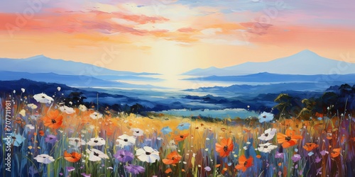 Oil painting flowers dandelion, cornflower, daisy in fields: a photo of a sunset meadow landscape with wildflower, hill and sky in orange and blue color background