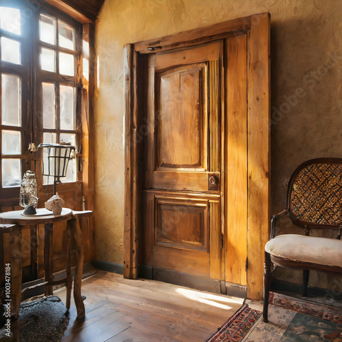 old wooden door.A rustic wooden door in a cozy room with warm, natural lighting, surrounded by vintage furniture and textured walls.