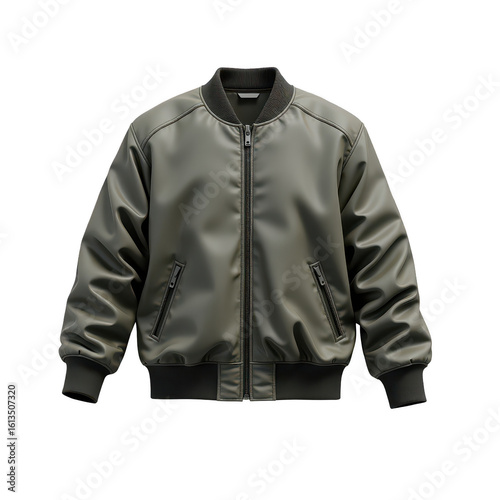 Olive green bomber jacket with zipper closure.