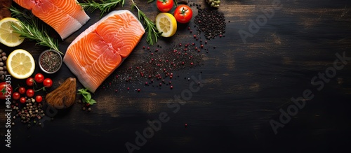 On a black background there is a fresh salmon steak placed next to sea salt pepper and lemon slices on a cutting board The top view of this scene provides ample copy space for additional content