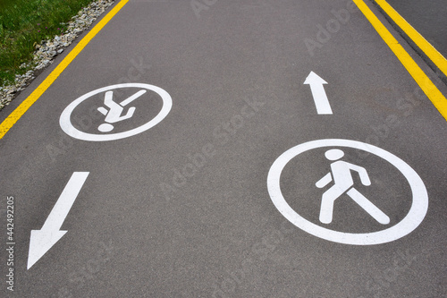 On the asphalt road there are signs for pedestrians in both directions, allowing movement for walking