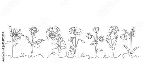 One line flowers border. Outline different botanical elements. Blossoms frame for cards and posters. Spring and summer decoration. Vector isolated black floral objects on white background illustration
