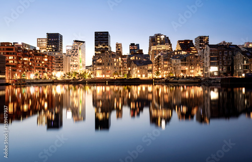 Oslo skyline at night reflecting on water, showcasing modern architecture and vibrant city lights, creating a serene urban atmosphere with copy space