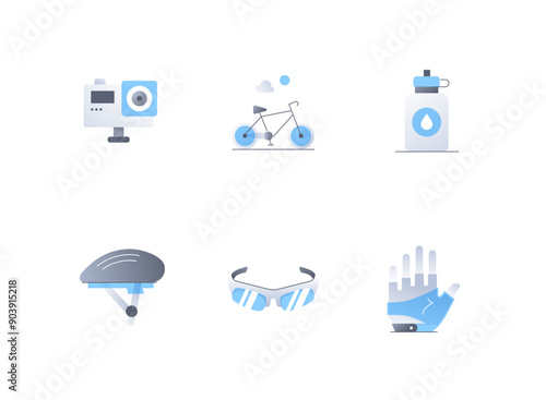 Outfit for a cyclist - flat design style icons set. High quality colorful images of action camera, two wheeler, water bottle, safety helmet, sunglasses, fingerless gloves. Sports goods and equipment