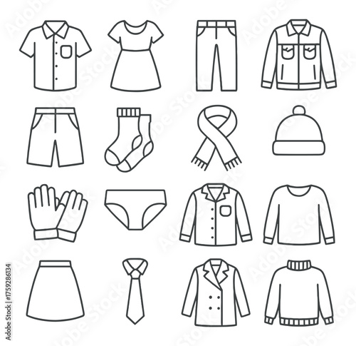 Outline of various clothing items on gray background including shirts and accessories