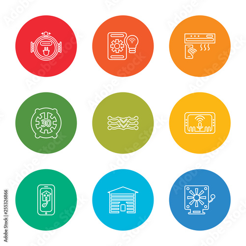 outline stroke fire alarm, garage, smart home, voice control, meter, thermostat, air conditioner, mobile, meter, vector line icons set on rounded colorful shapes