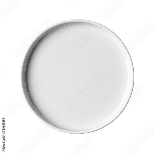 Overhead view of a glossy, pristine, white, circular ceramic dish, centered on a black background
