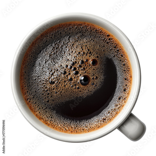 Overhead view of a white mug filled with dark, foamy coffee against a solid black background