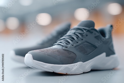 pair of sleek sports shoes on smooth clean gym floor people blurred in background for focus