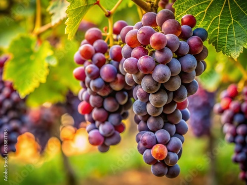 Panoramic Crimson Grapes: Juicy, Ripe Dark Red Grapes Hanging on Vine