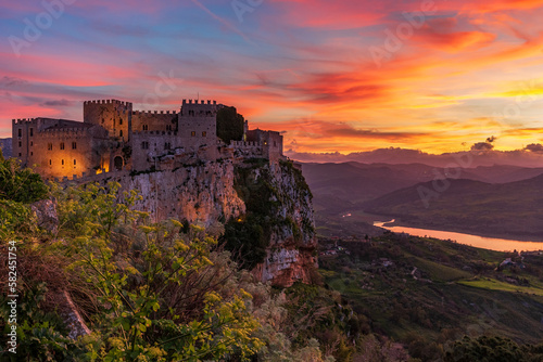 Panoramic view of Caccamo castle at dusk, province of Palermo IT