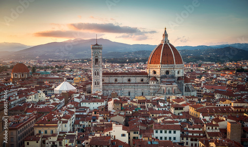Panoramic view of Florence sunset city skyline with Cathedral and bell tower Duomo and Palazzo del Bargello. Florence, Italy.